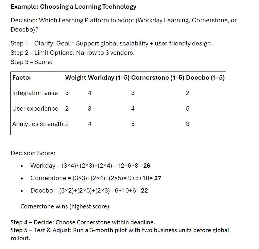 Decision Score = Σ (Factor Weight × Option Rating) → Pick the option with the highest score.